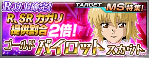 并且在黄金MS征用中追加R“嫣红攻击高达”。且搭配在黄金驾驶员征用中的SR、R“卡佳里.由拉.阿斯哈”出现机率变成2倍。