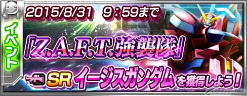 首次的防卫任务活动“Z.A.F.T.强袭队”中,选择在活动期间内才有举办的防卫任务,就会有Z.A.F.T.的大部队来进攻我方基地。击退一批一批进攻而来的Z.A.F.T.MS部队,获得SR“神盾高达”,目标是最大进化。