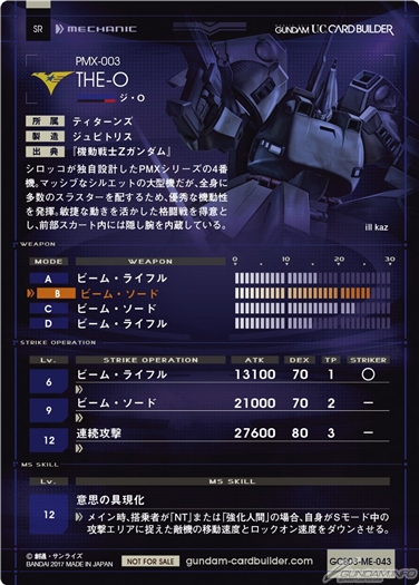 是一张符合「410」代价的高水准卡片。技能「意念的具现化」虽只能在战术等级12以後才发动,但效果惊人。一定要让「NT」或「强化人」来搭乘。