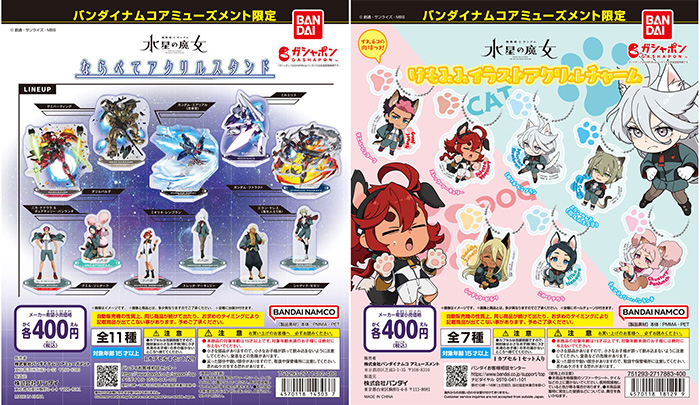 扭蛋商品“Bandai Namco Amusement限定 机动战士高达 水星的魔女 排排站压克力立牌”“兽耳插图压克力吊饰”将于12月第3周开始逐步发售。每个商品售价为每次400日圆(含税)。