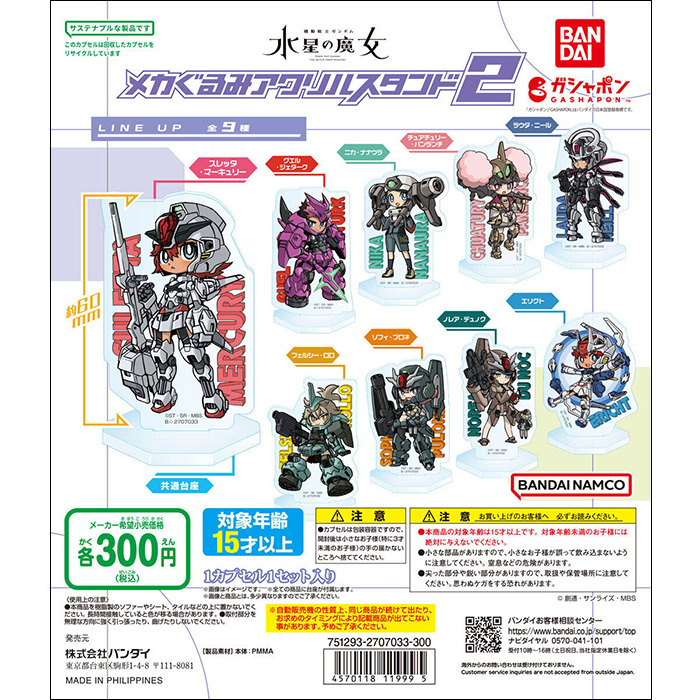 转蛋商品“机动战士高达 水星的魔女 机体玩偶压克力立牌2”,决定于2024年1月发售。售价为1次300日圆(含税)。