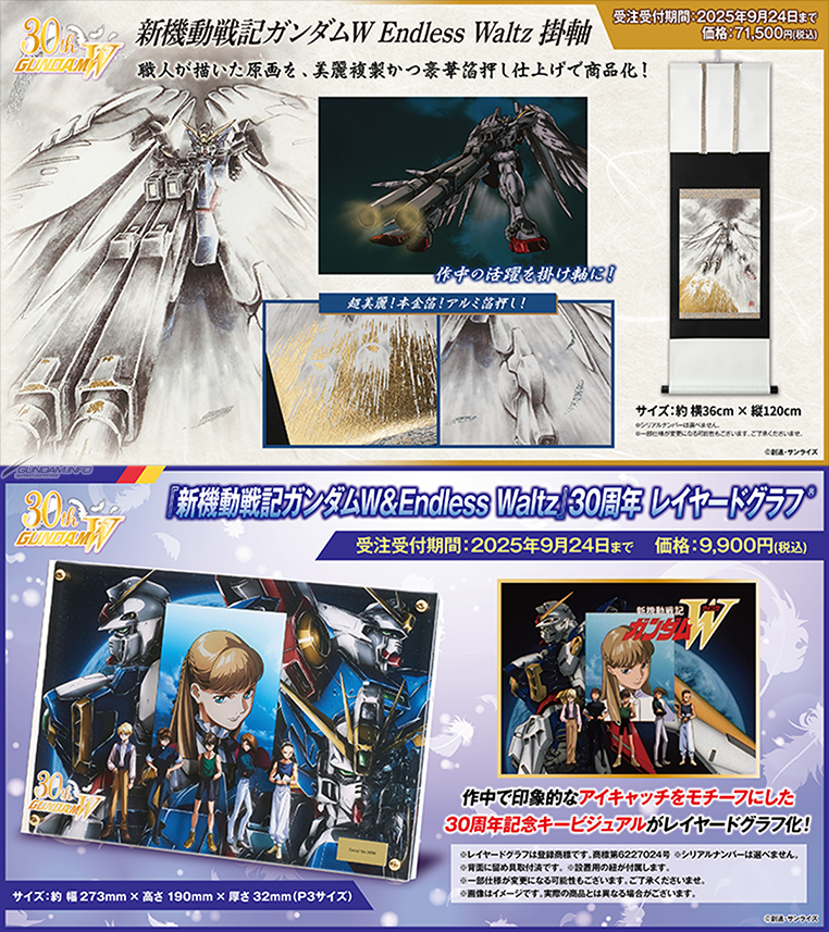“机动战士高达W 无尽华尔兹”挂轴“和”机动战士高达W & 无尽华尔兹 30 周年分层图“现已在 A-on STORE 和 Premium Bandai 的”Sunrise Store“接受订单。