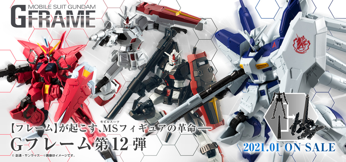 在骨架装上装甲来完成的高精密度可动高达公仔系列“机动战士高达 G FRAME”第12弹,决定于2021年1月发售。售价为各500日圆(未税)。