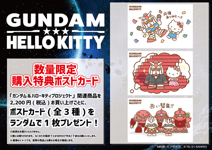 每购买“高达&Hello Kitty Project”相关商品达2,200日圆(含税),就会随机获赠一张明信片(共3种)!