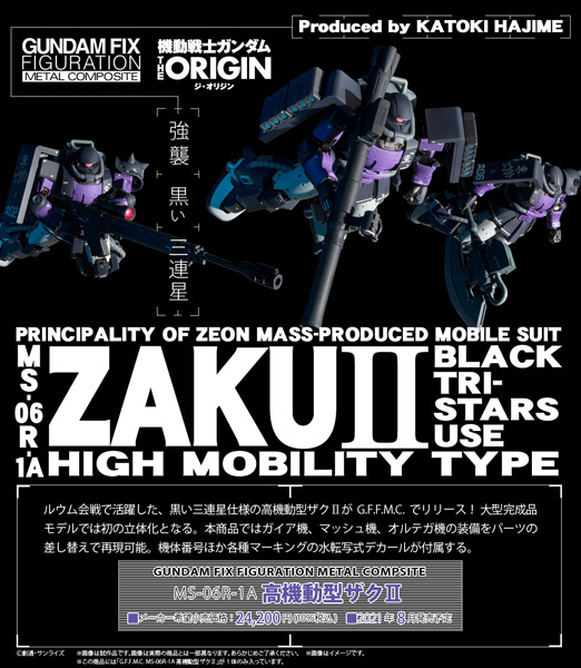 ‘机动战士钢弹 THE ORIGIN’中,以“黑色三连星”的外号闻名的盖亚、奥尔提加、马修驾驶的高机动型渣古II,由Katoki Hajime监修首次于大型完成品模型立体化。