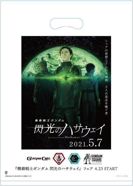 高达官方咖啡厅“GUNDAM Café”各门市和大阪的“GUNDAM SQUARE”,‘闪光的哈萨维’设计式样的购物袋正登场中。