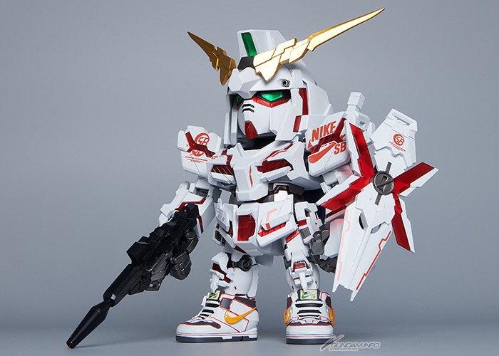 本产品是将经由艺术玩具艺术家TOUMA之手改进成QSTYLE的独角兽高达,穿上今年发售的胶底运动鞋“Nike SB X Unicorn Gundam Dunk High”的特别样式,高达本体印上这次才有的NIKE SB LOGO等标记。