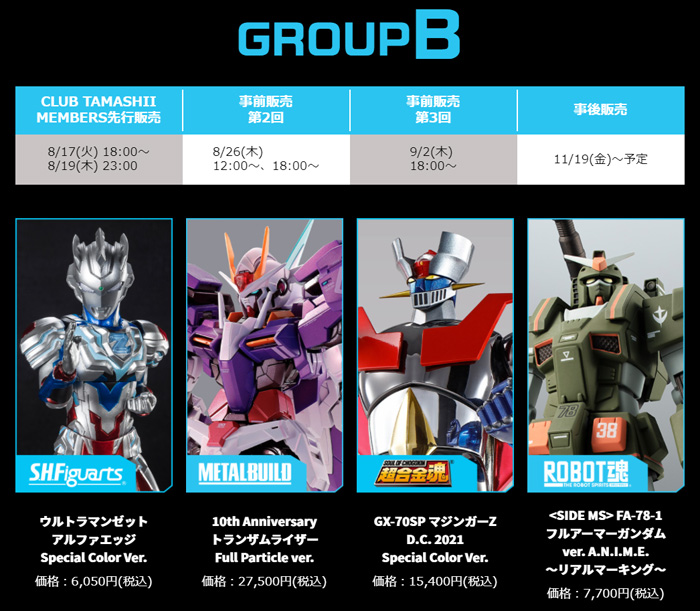 8月24日(二)开始的提前贩售前,预定8月17日(二)起开放给“CLUB TAMASHII MEMBERS” Ocean ・ Flame ・ Aurora 等级会员限定抢先开卖。