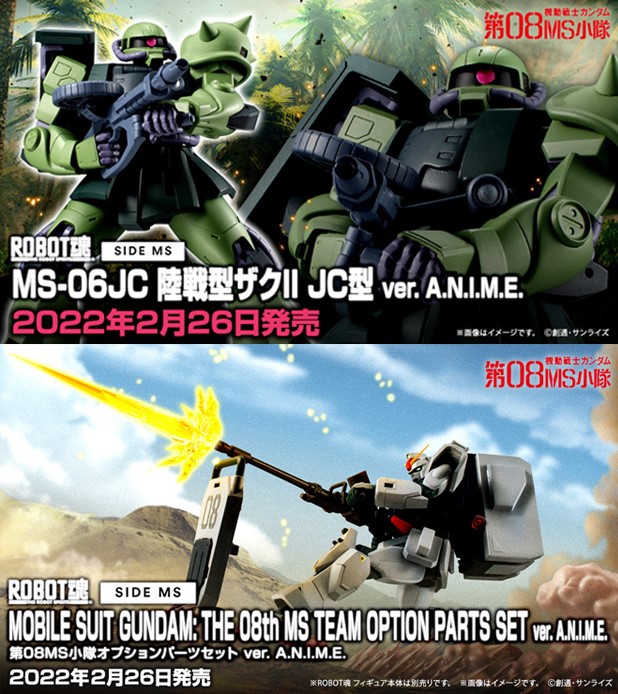 ロボットフィギュアシリーズ「ROBOT魂 ver. A.N.I.M.E.」より、「陸戦型ザクII JC型」と「第08小隊オプションパーツセット」が、本日2月26日(土)に発売される。