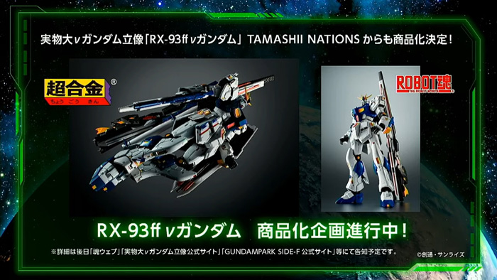 于预定4月25日(一)开始营业的福冈啦啦宝都建设中的“实物大ν高达立像”,决定于完成品公仔品牌・魂NATIONS推出的“超合金”和“ROBOT魂”商品化。敬请期待后续报导。