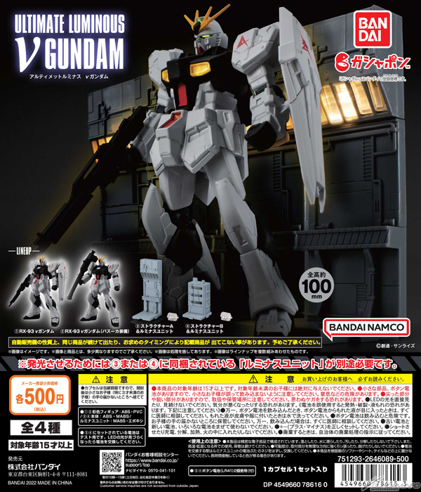 转蛋商品“机动战士高达 Ultimate Luminous ν高达”,12月第4周起将会在全日本的玩具卖场等处的转蛋机发售。价格1次500日圆(含税)。