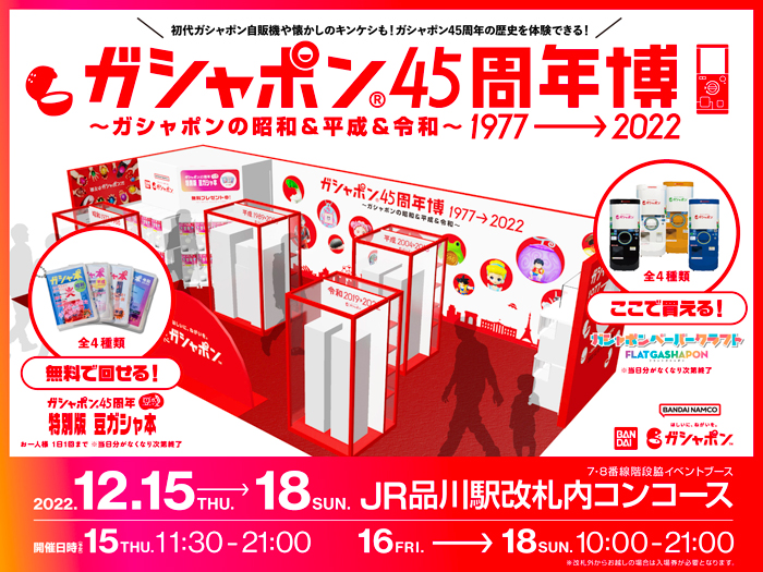 为纪念转蛋玩具“GASHAPON”迎接45周年,12月15日(四)起将将会在东京JR品川车站验票口内中央大厅7・8号线楼梯旁的活动摊位,举办快闪活动“GASHAPON 45周年博览会 1977→2022 ~GASHAPON的昭和&平成&令和~”。开放免费入场。