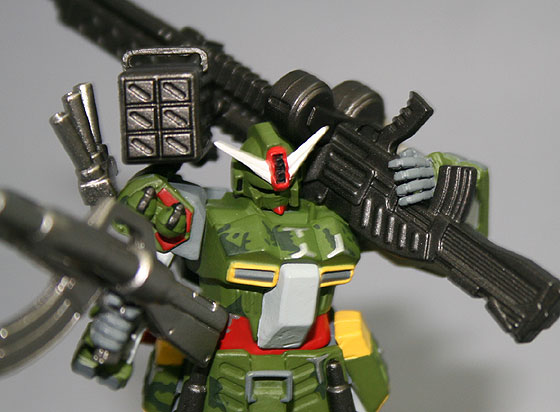 | 巧妙地操纵许多武器的「指挥官高达」。深绿色的主体,再加上红色、黄色鲜明地点缀,让人有充满活力的印象。就连细部都相当纤细的制作,也请注目各武器的细部喔! | |