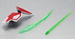 不仅可以只拿掉手掌就变形成飞行型态,还能藉由替换腹部的零件,重现更漂亮的外型。特征的飞翼采用了玩具原创的机构,可以大幅度地开闭。光束军刀除了附上通常版本以外,还有动作中的版本。