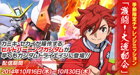 季节限定挑战任务“激斗!大运动会”是配合“运动之秋”来推出的,“BUILD G”弹值得纪念的第一次挑战任务里,好评播出的‘高达创斗者TRY’主角神木世界所操作的“制作燃烧高达”抢先登场。