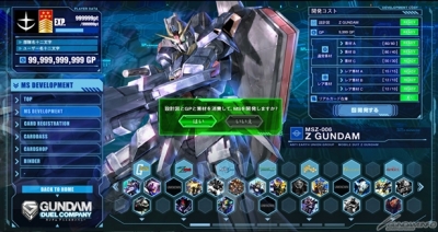 新模式“MS开发”是使用游戏内通用货币“GP”,和游戏中可以获得的“设计图”和“素材”投资开发公司后,就可以开发限定MS。开发出的卡片不只是数位卡片,也可以从CARD DASS DIRECT获得实体卡片。