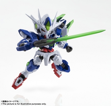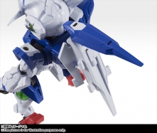 既使比例缩小仍在全身加入了许多细节之外,也在胸部的GN炉和GN剑BIT等各部位首用了透明零件。“GN剑BIT”除了附属专用的支柱外,也可以替换“GN剑V”的尖端再现“GN破坏巨剑”。此外,和预定于11月发售的“NXEDGE STYLE 异端高达红色机”相同,附属了泛用斩击特效零件,可以透过替换合提高系列的可玩性。