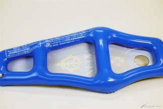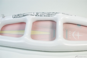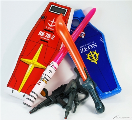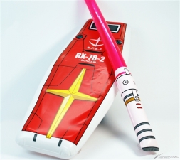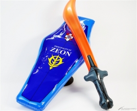 接着是介绍盾牌和军刀的套组。本套组是类似海滩球的充气玩具,这次发售的分别是高达盾牌 / 光束军刀的套组和盾牌 / 电热刀的套组。盾牌的表面有阿姆罗・雷和兰巴・拉尔的个人标志,整体外观相当写实。背面是可以用手握住的样式,可以实际当做盾牌来摆姿势。有这样的玩具,相信就会想要大喊「这跟渣古是不一样的、不一样的阿!!」来挥舞,但因为大家都是大人所以还请忍耐。还有不可以拿来乱挥或是打人。不管如何请当作是享受氛围的商品,也可拿来反击刚刚介绍过的水枪,搭配来游玩说不定会很有趣。