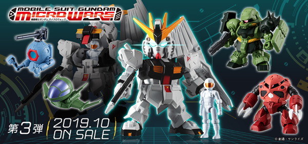 总高度约32mm的「可动驾驶员模型」,以及「搭载舱门开启机构的机体模型」所组成的全新食玩系列「微型战场」第3弹,其阵容有「ν高达」、「钢球&驾驶员」、「基拉・德卡」、「夏亚专用魔蟹」和「托普&驾驶员」共5款。能和第1弹及第2弹的商品配合,享受自己专属的「微型战场」。