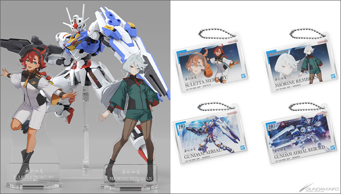 压克力球链吊饰使用“Figure-rise Standard 斯莱塔·墨丘利”“Figure-rise Standard 米奥莉奈·伦布兰”“HG 风灵高达”“HG 风灵高达(修改型)”的包装盒画稿。尺寸皆约41×64mm,适合挂在包包上。
