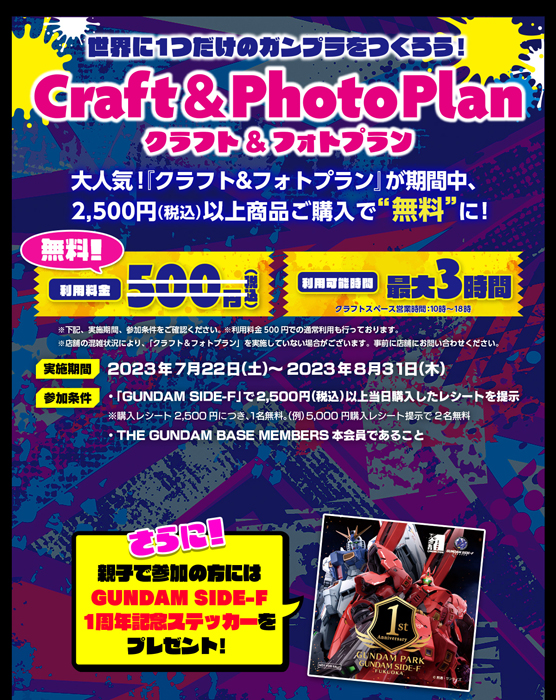 同时,为纪念GUNDAM SIDE-F一周年,只要消费含税满2,500日圆以上就可以免费获得“组装&摄影方案”的活动也于明天7月22日(六)开始,此外8月开始也将举办“高达R(Recycle)作战2023”,不要错过。