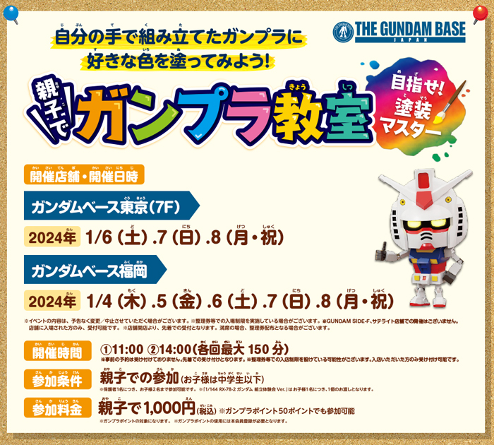 高达基地决定举办“亲子高达模型教室 目标成为涂装大师”!东京门市将于1月6日开始,福冈门市将于1月4日开始!