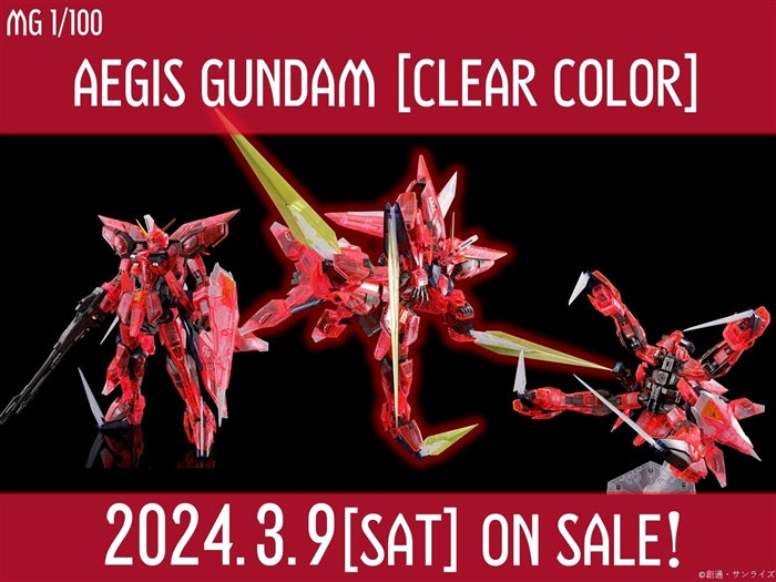 活动限定商品“MG 1/100 神盾高达〔透明配色〕”,将在3月9日(六)于高达模型综合设施“THE GUNDAM BASE”门市发售。价格为5,610日圆(含税)。