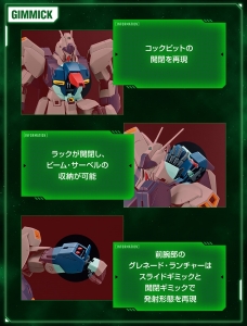 机体各处的外装甲以全新造形重现,内部骨架和各关节采用全新零件。除了驾驶舱的开阖外,前腕部的榴弹发射器也可以透过滑动机构和开阖机构再现发射状态。此外,也可以藉由背包的开阖收纳光束军刀。