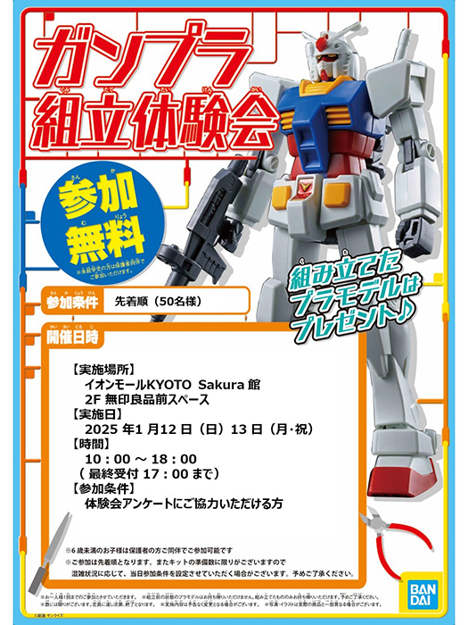 “高达模型组装体验会”将于1月12日(日)・13日(一・国定假日)在永旺梦乐城KYOTO的“THE GUNDAM BASE SATELLITE KYOTO”举办。