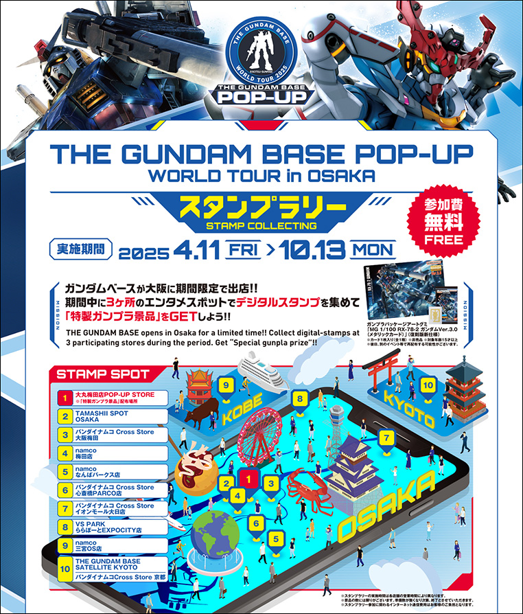 此外,将同时举办邮票拉力赛,期间可在三个娱乐场所收集数字邮票,获得“特别高达模型奖品”。 「THE GUNDAM BASE SATELLITE KYOTO」和「TAMASHII NATIONS STORE Satellite in OSAKA 2025”也是符合资格的景点,千万不要错过这个机会。