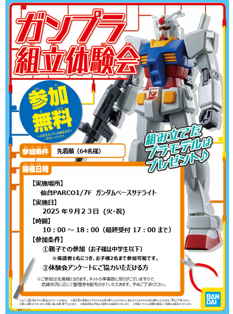 将于9月23日举办“高达基地卫星仙台”,举办“高达模型组装体验”! 免费参加!