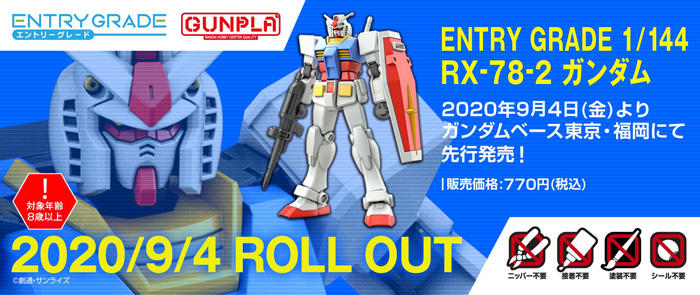 “ENTRY GRADE 高达”将于本日9月4日(五)起,在高达模型综合设施“THE GUNDAM BASE(高达基地)”举行先行贩售。售价为770日圆(含税)。