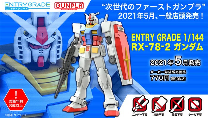塑胶模型“ENTRY GRADE 高达”将于5月发售,任何人都可以如开心玩游戏般简单制作。价格为770日圆(含税)。