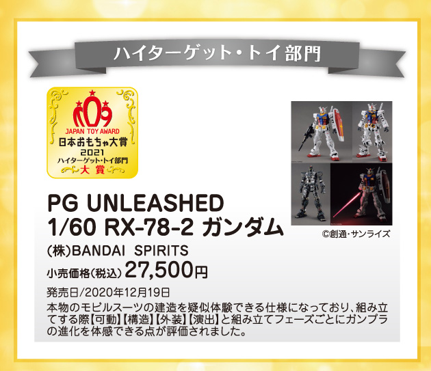 高达模型“PG UNLEASHED 1/60 RX-78-2 高达”荣获日本玩具协会主办的“日本玩具大奖2021”高阶玩具部门大奖。