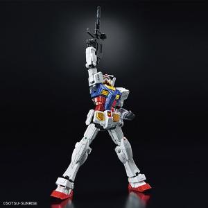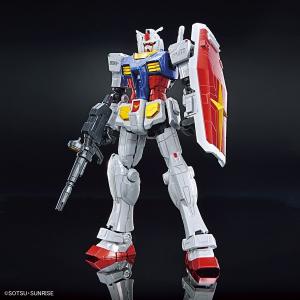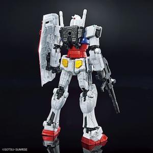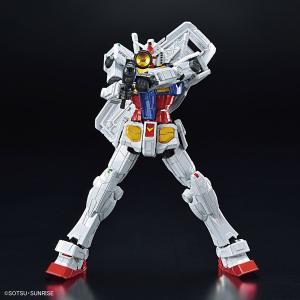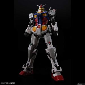 除了可动实物大高达的步行、举起右腕、举起两腕等动作外,连细节及配色也都以1/100比例重现。不只有箔面贴纸、标志贴纸,还附有商品原创的专用底座、步枪、盾牌。