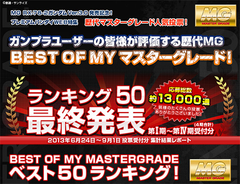 本次投票总共收到了来自高达模型玩家约13,000份的投票,在前50名的高达模型中荣获第1名荣耀的是“MG ν高达 Ver.Ka”(2012年12月发售)。
