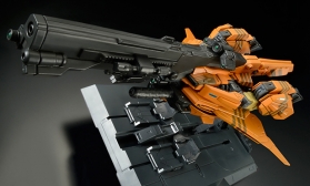 此外表面的细节也以各种刻纹重线,并附赠专用配色贴纸和个人标志等的条状标志,能重现令人印象深刻的迷彩涂装。弹射器造型的专用支架,能够展示MS形态跟WAVE RIDER形态。