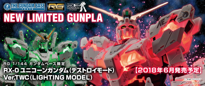 这次公开的有「RG 高达基地限定 独角兽高达(毁灭模式)Ver.TWC〔LIGHTING MODEL〕」、「HG 高达基地限定 独角兽高达(毁灭模式)〔PAINTING MODEL〕」2款。