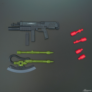 另外作为原创零件,不只有一般版的头部,还附有“指挥官用”和“战斗钢盔”头部,并附有MMP-80机关枪、电热斧、手掷榴弹。