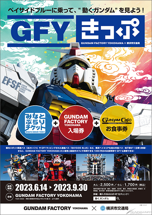 本套票是将能享受到约80间设施・合作商店特典服务的横滨港埠区市营交通工具1日票“港埠闲逛优惠票”、“GFY入场门票”以及GFY内“GUNDAM Cafe用餐礼券”3种票券成套贩售的方便套票。成人2,500日圆(含税)、孩童1,700日圆(含税),不管是成人或小孩都会比一般价格优惠650日圆。
