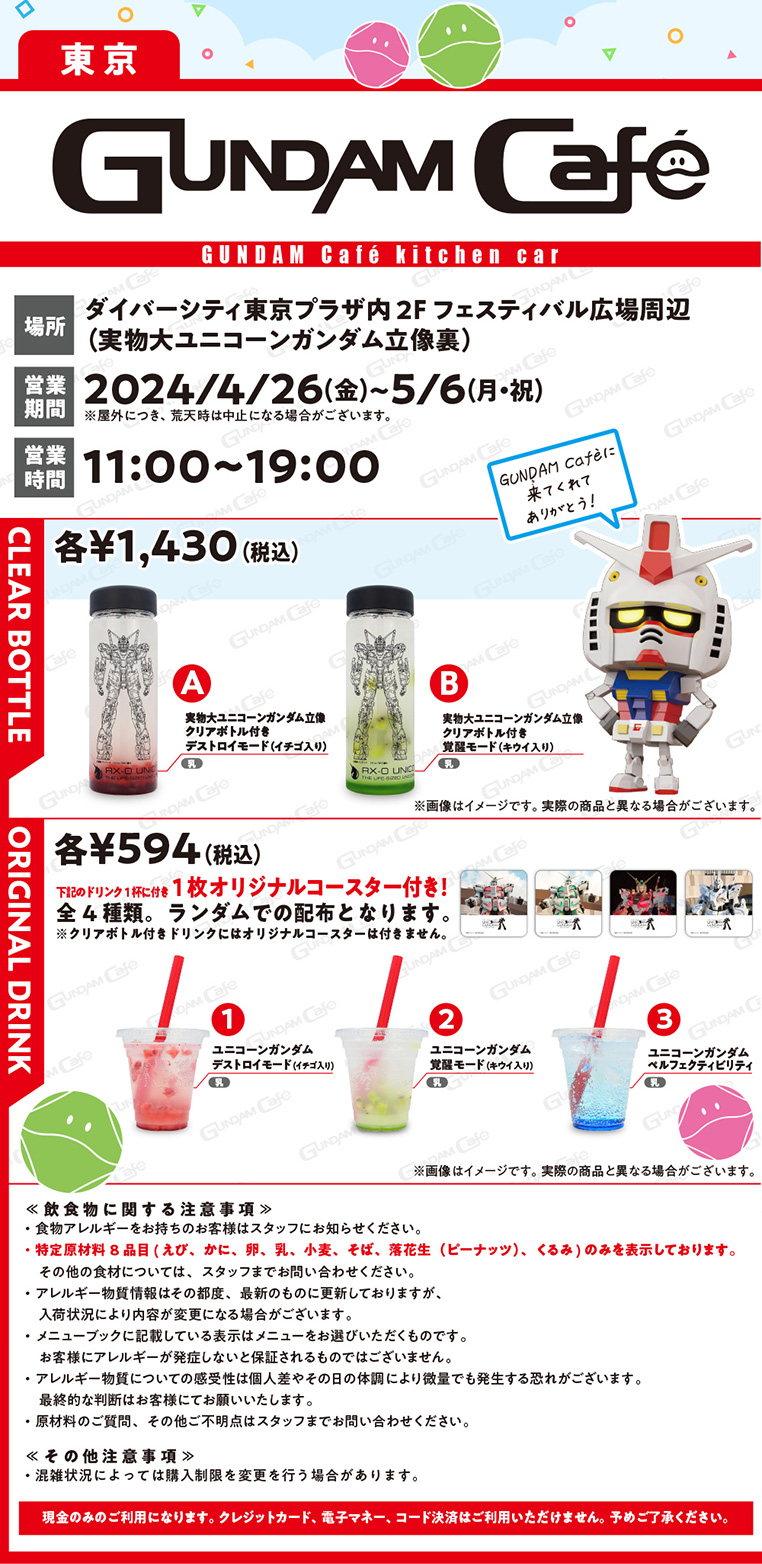 东京将会有“GUNDAM Cafe”餐车登场。贩售“实物大独角兽高达立像”作为设计的透明水瓶饮品、以及附杯垫的独家饮品。