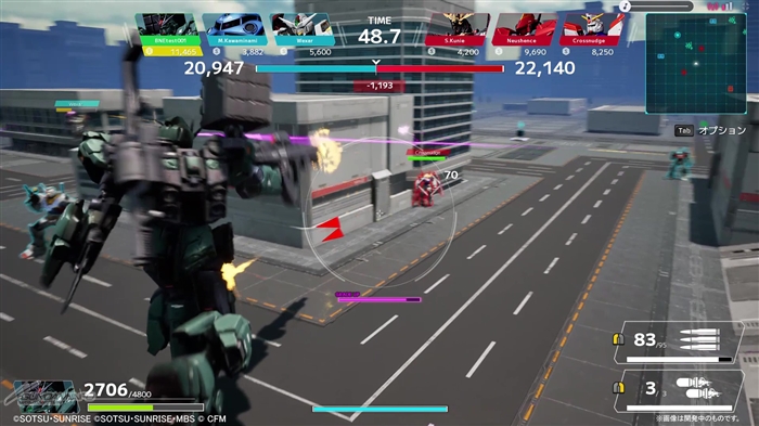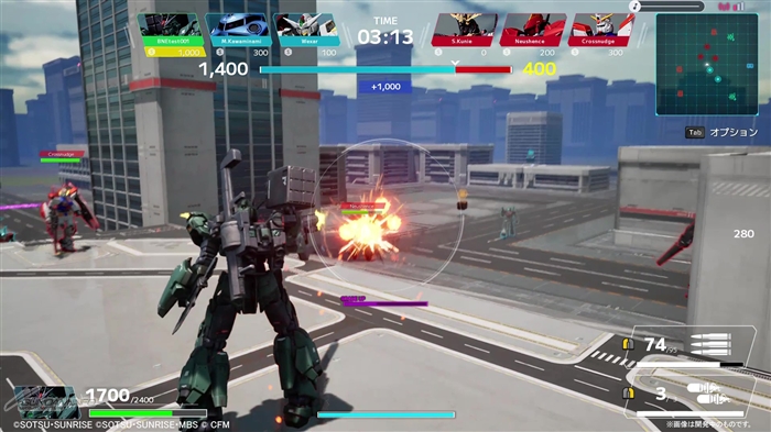 “3on3 对战”,正如其名是玩家间的3对3团队战斗。在玩家间队伍战斗的同时,地图上也会出现敌方NPC机体的三方大乱斗。除了玩家对战斗外,还有熟悉操作的训练模式。