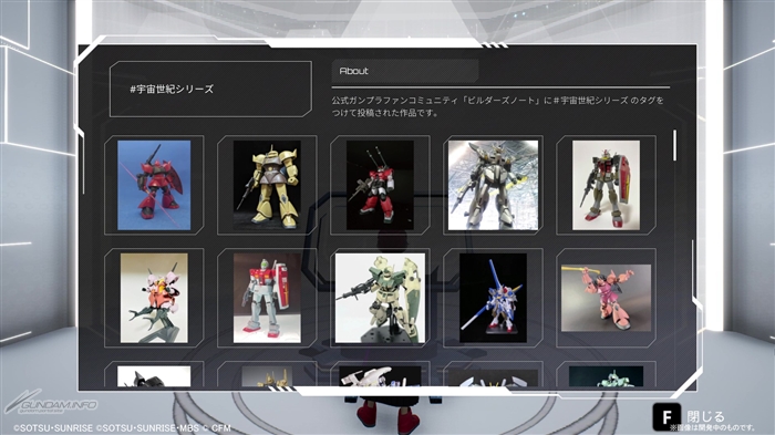 将高达模型官方社群“Builders Note”中活动的高达模型社团的作品,“Builders Note”内投稿的作品照片以博物馆的形式展示。也可以对作品进行回应。实际作品数量超越1,000个(!),展示许多高达模型照片并随着展示主题每天更新,会轮流替换作品。