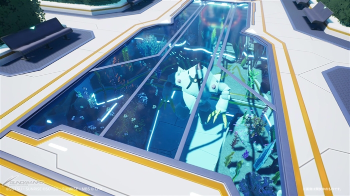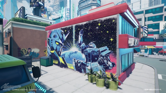 主大厅内有似乎在哪看过的车辆、艺术品及高达粉丝很熟悉的企业广告,还充满以“高达系列”各种作品为题材的街头艺术。其中还有重现存在于现实世界的名胜的情况。