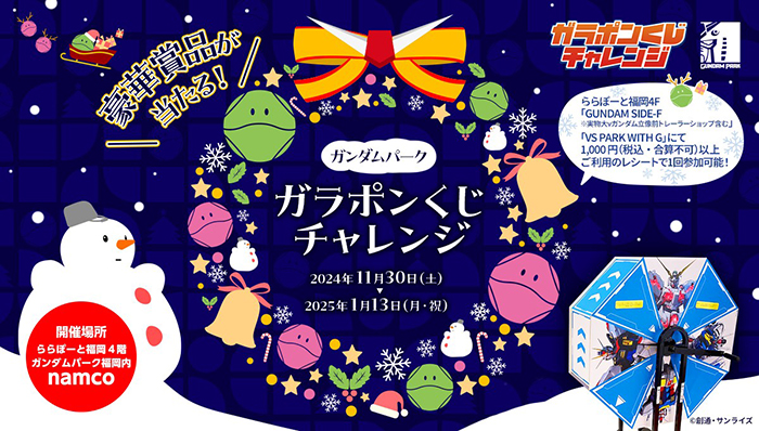 在福冈啦啦宝都 4F “GUNDAM SIDE-F ※含实物大ν(Nu)高达立像前拖车商店”・“VS PARK WITH G”只要出示于消费 1,000 日圆(含税・不可累积)以上的明细,便可参加一次转蛋抽奖。