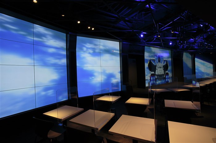 让人联想到战舰窗户,全长18m的大型多重荧幕,会放映在宇宙空间飞行的MS等事物,可以享受到宛如在宇宙战舰内用餐的投入感。