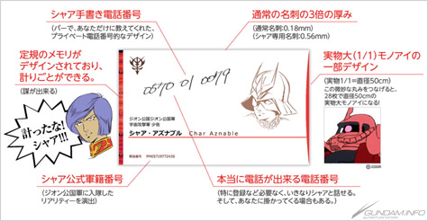 拥有一般名片3倍0.56mm厚度的夏亚名片,除了印有能够和夏亚通话的专用回线号码外,边框设计成尺规能够进行“测量(=算计)”,还设计成为“实物大小渣古眼”的一部分等等,附有多种有趣机能!