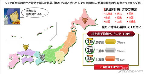 这里有夏亚和全国战士通过话的结果,将感觉‘只是个少爷啊’的人们数字化,以各都道府县的平均分数排成排行榜。现在“孩子气”全国第1名为岛根县,但是这到底是一件光荣的事吗,还是…??