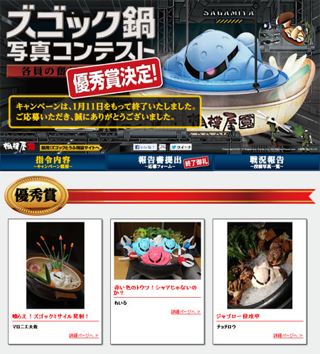 由相模屋食品所举办的“兹寇克火锅 摄影竞赛”,比赛内容是募集使用好评发售中的“火锅用!兹寇克豆腐”来表现高达世界观的‘模型场景食谱’。在竞赛特设网站中已经公布了活动的优胜及入选作品了。