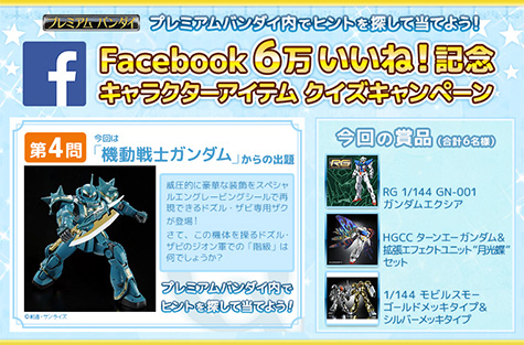 本活动是为了纪念“PREMIUM BANDAI Facebook 粉丝页”在去年12月达成6万个赞!而举办,只要回答出Facebook上人气角色周边商品相关的问题,就有机会获得豪华奖品。